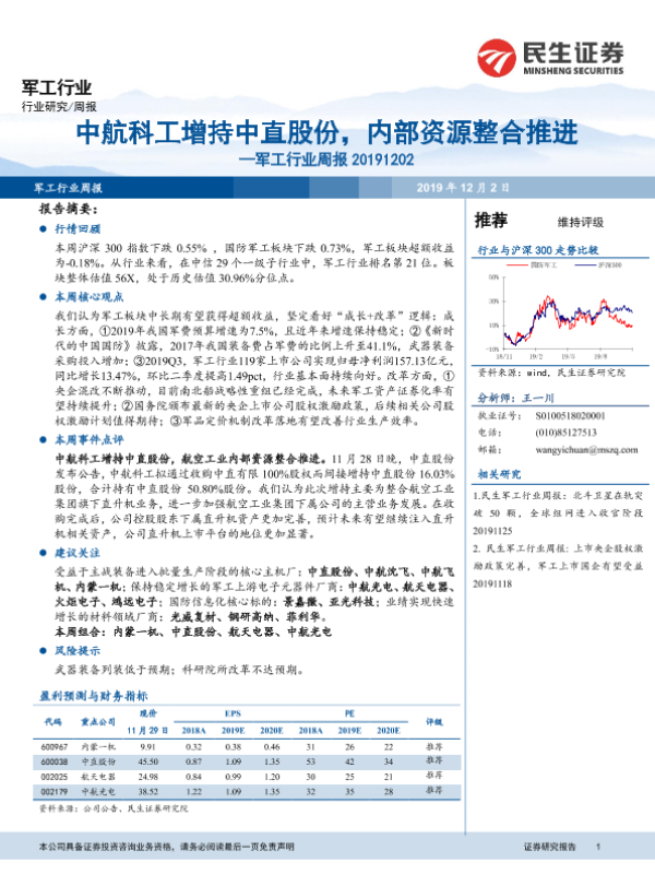 【民生证券】【20191202】20191202-民生证券-军工行业周报:中航科工增持中直股份,内部资源整合推进-22页 行业研究