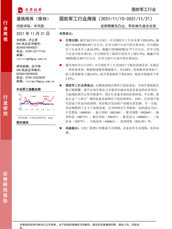 【东莞证券】【20211121】20211121-东莞证券-国防军工行业周报:逆周期属性凸出,军机换代逐步兑现-10页 行业研究