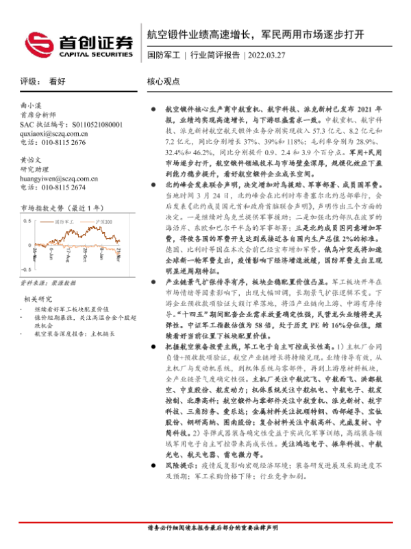 【首创证券】【20220327】20220327-首创证券-国防军工行业简评报告:航空锻件业绩高速增长,军民两用市场逐步打开-6页 行业研究