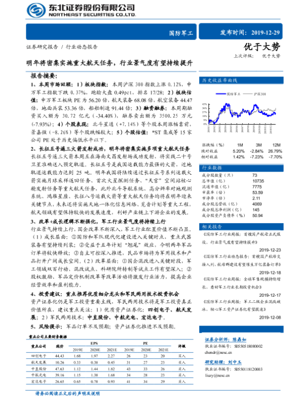 【东北证券】【20191229】20191229-东北证券-国防军工行业动态报告:明年将密集实施重大航天任务,行业景气度有望持续提升-19页 行业研究