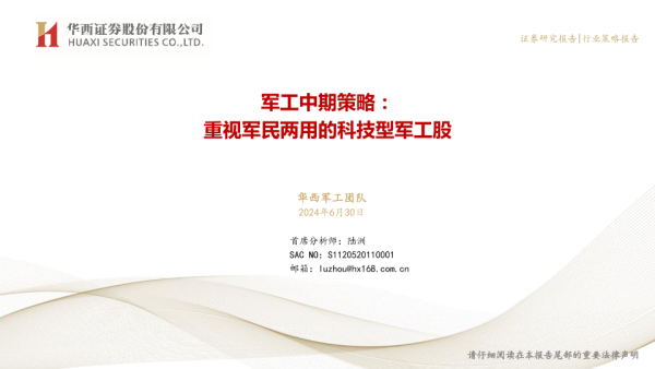 【华西证券】【20240630】20240630-华西证券-军工中期策略:重视军民两用的科技型军工股-18页 行业研究