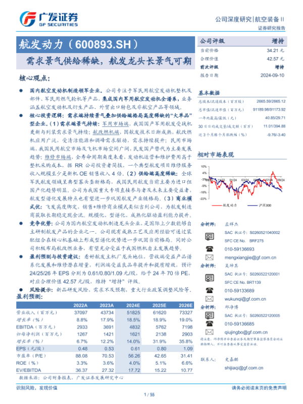 【广发证券】【20240910】航发动力(600893)需求景气供给稀缺,航发龙头长景气可期-55页 行业研究