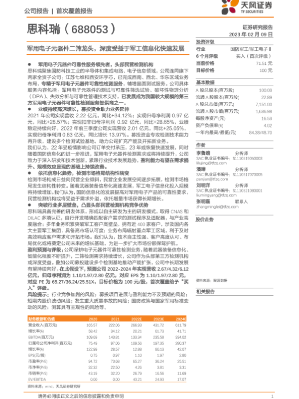 【天风证券】【20230209】思科瑞-军用电子元器件二筛龙头,深度受益于军工信息化快速发展-15页 行业研究