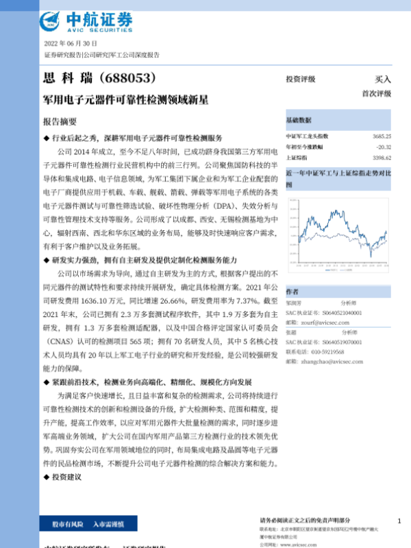 【中航证券】【20220630】思科瑞-688053.SH-军用电子元器件可靠性检测领域新星-27页 行业研究