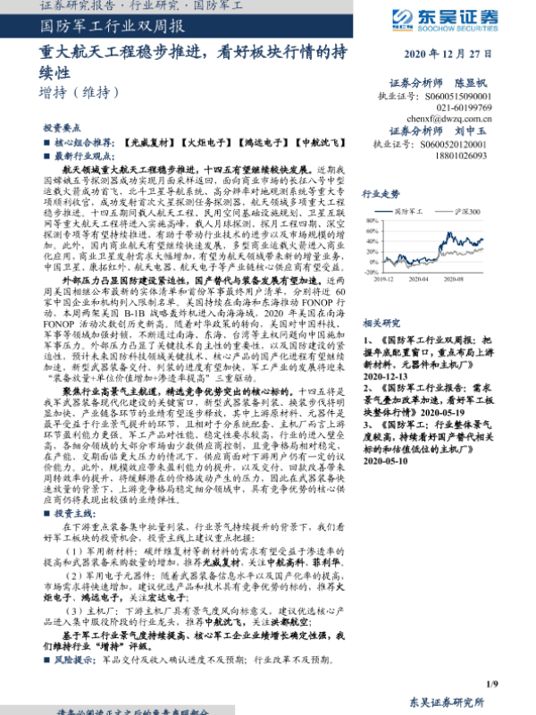 【东吴证券】【20201227】20201227-东吴证券-国防军工行业双周报:重大航天工程稳步推进,看好板块行情的持续性-9页 行业研究