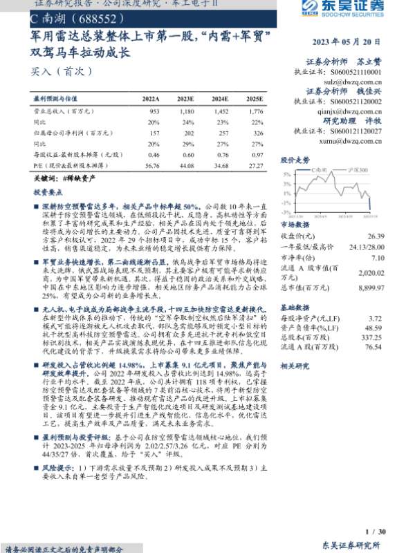 【东吴证券】【20230520】军用雷达总装整体上市第一股,“内需+军贸”双驾马车拉动成长-30页 行业研究