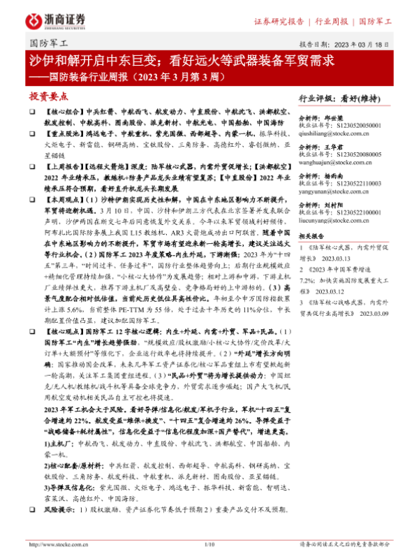 【浙商证券】【20230318】国防装备行业周报(2023年3月第3周):沙伊和解开启中东巨变;看好远火等武器装备军贸需求-10页 行业研究