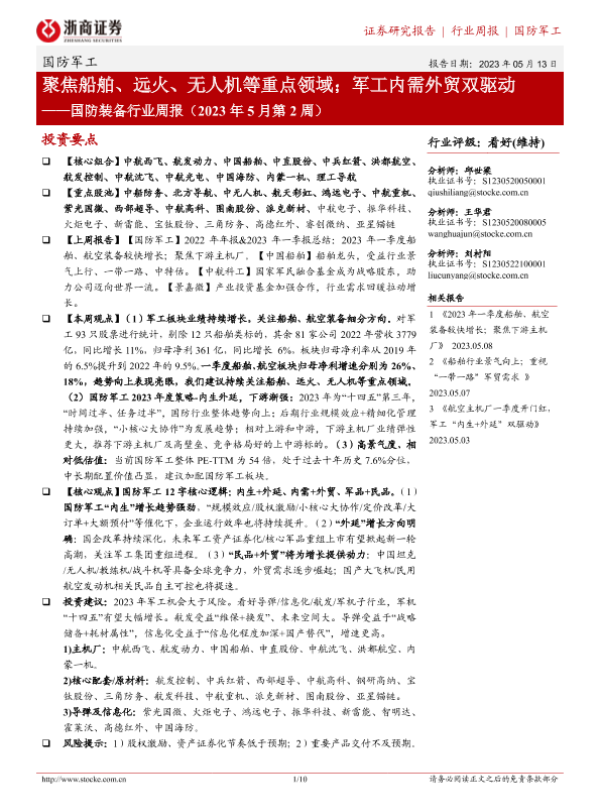 【浙商证券】【20230513】国防装备行业周报(2023年5月第2周):聚焦船舶、远火、无人机等重点领域;军工内需外贸双驱动-10页 行业研究