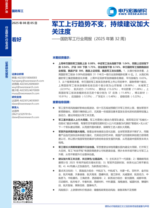 【申万宏源】【20250805】国防军工行业周报:军工上行趋势不变,持续建议加大关注度-6页 行业研究