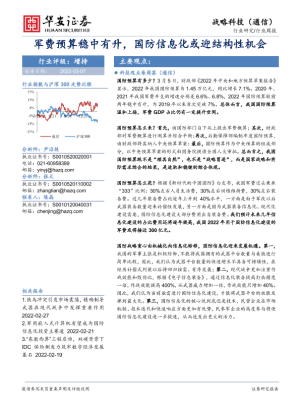 【华安证券】【20220307】20220307-华安证券-战略科技(通信)行业周报:军费预算稳中有升,国防信息化或迎结构性机会-14页 行业研究