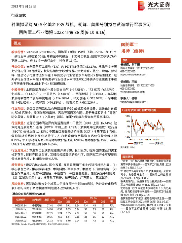 【光大证券】【20230918】国防军工行业周报2023年第38周:韩国拟采购50.6亿美金F35战机,朝鲜、美国分别拟在黄海举行军事演习-16页 行业研究