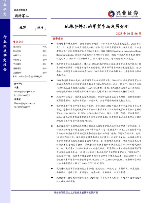 【兴业证券】【20230606】地缘事件后的军贸市场发展分析-13页 行业研究