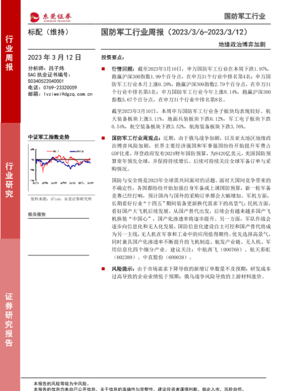 【东莞证券】【20230312】20230312-东莞证券-国防军工行业周报:地缘政治博弈加剧-10页 行业研究