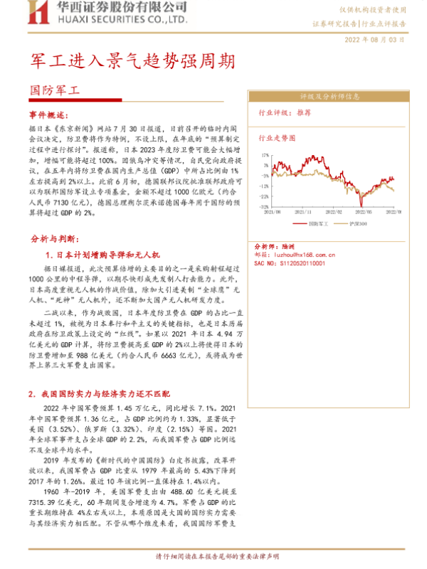 【华西证券】【20220803】国防军工行业点评报告:军工进入景气趋势强周期-5页 行业研究