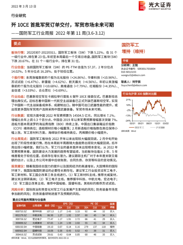 【光大证券】【20220313】国防军工行业周报2022年第11周:歼10CE首批军贸订单交付,军贸市场未来可期-9页 行业研究