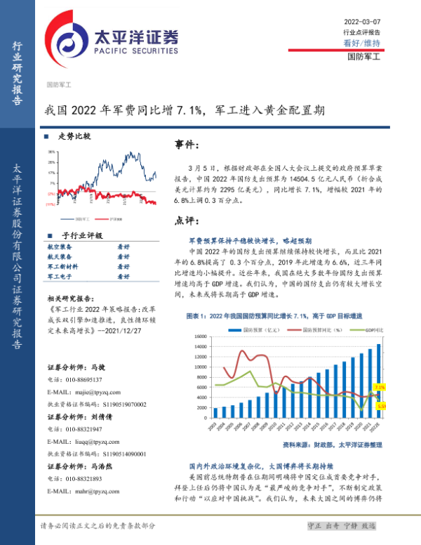 【太平洋证券】【20220307】我国2022年军费同比增7.1%,军工进入黄金配置期-7页 行业研究