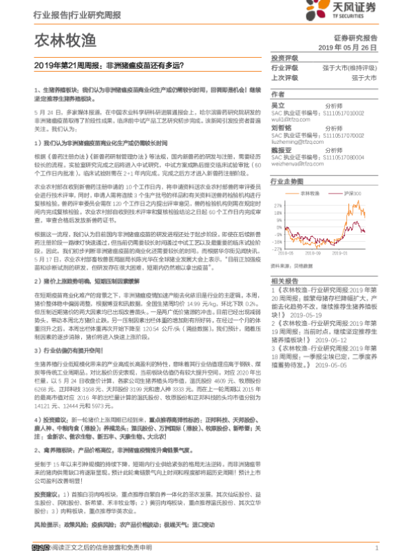 【天风证券】【20190526】农林牧渔2019年第21周周报:非洲猪瘟疫苗还有多远?-14页 行业研究