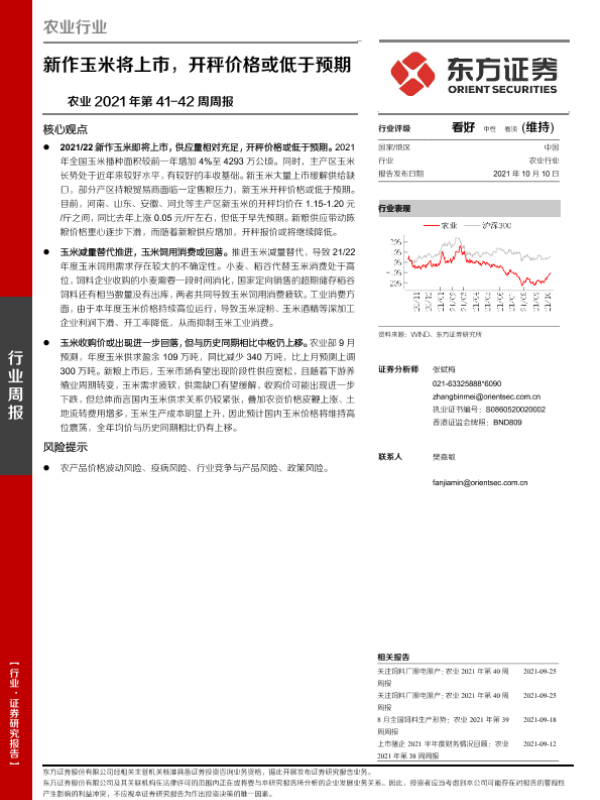 【东方证券】【20211010】农业2021年第41-42周周报:新作玉米将上市,开秤价格或低于预期-10页 行业研究