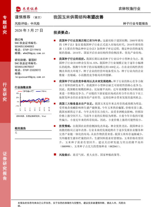 【东莞证券】【20200527】20200527-东莞证券-种子行业专题报告:我国玉米供需结构有望改善-26页 行业研究