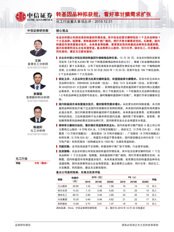 【中信证券】【20191231】化工行业重大事项点评:转基因品种拟获批,看好草甘膦需求扩张-3页 行业研究