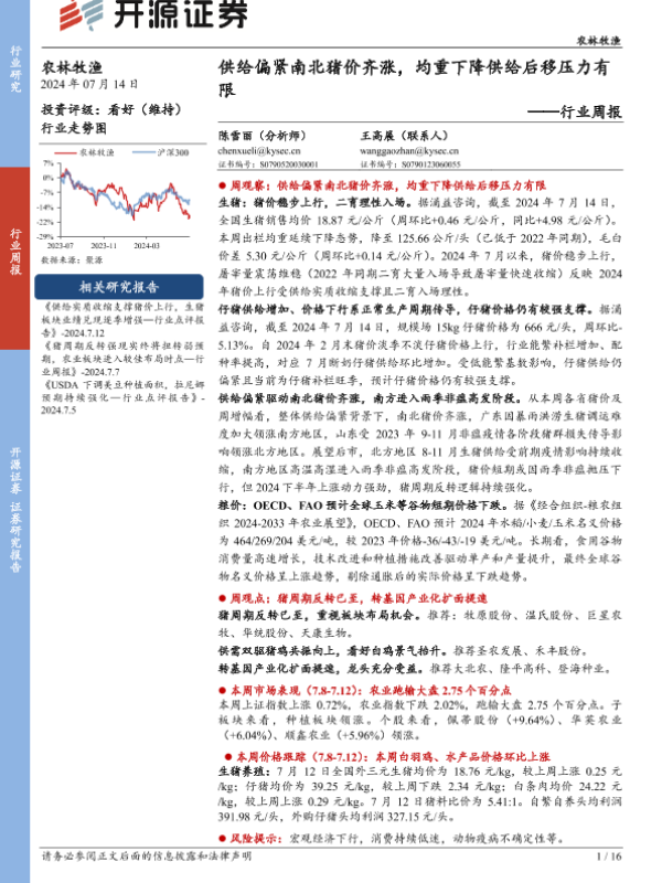 【开源证券】【20240714】供给偏紧南北猪价齐涨,均重下降供给后移压力有限-16页 行业研究
