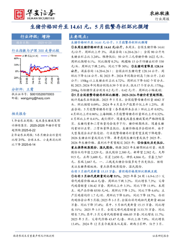 【华安证券】【20250628】农林牧渔行业周报:生猪价格回升至14.61元,5月能繁存栏环比微增-43页 行业研究