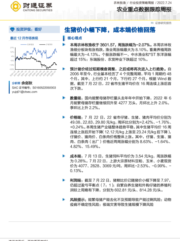 【财通证券】【20220724】20220724-财通证券-农业重点数据跟踪周报:生猪价小幅下降,成本端价格回落-6页 行业研究