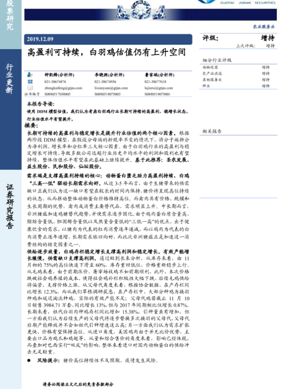 【国泰君安证券】【20191209】高盈利可持续,白羽鸡估值仍有上升空间-17页 行业研究
