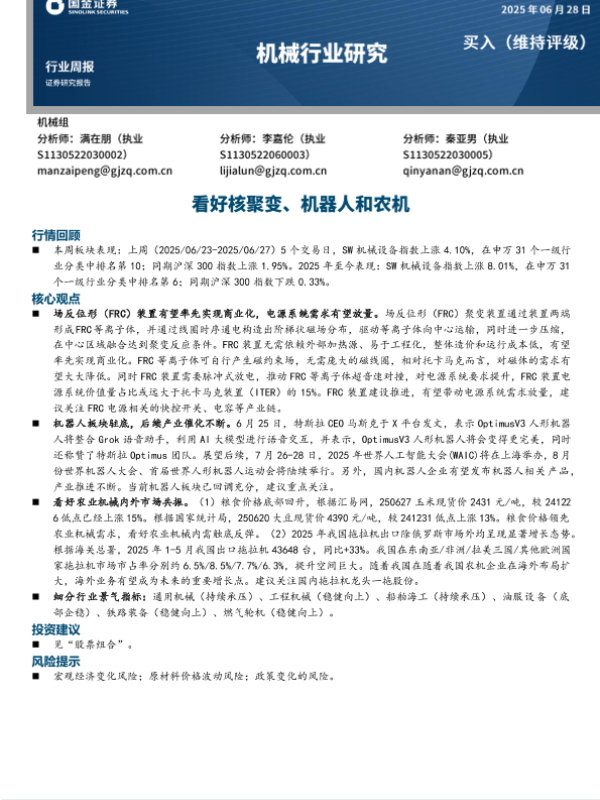 【国金证券】【20250628】机械行业周报:看好核聚变、机器人和农机-15页 行业研究