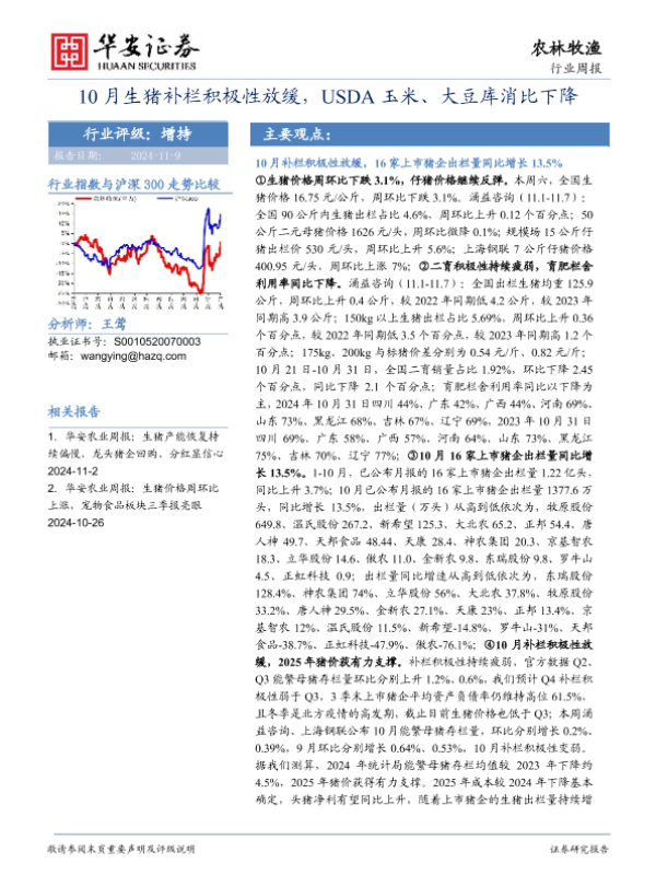 【华安证券】【20241109】20241109-华安证券-农林牧渔行业周报:10月生猪补栏积极性放缓,USDA玉米、大豆库消比下降-42页 行业研究