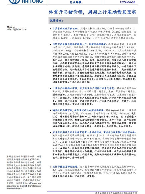 【海通国际】【20240408】农业行业:体重升而猪价稳,周期上行基础愈发坚实-18页 行业研究