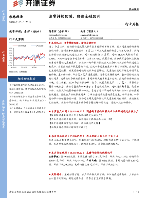 【开源证券】【20200523】20200523-开源证券-农林牧渔行业周报:消费持续回暖,猪价企稳回升-9页 行业研究