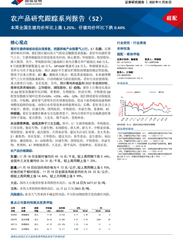 【国信证券】【20221120】20221120-国信证券-农产品研究跟踪系列报告(52):本周全国生猪均价环比上涨1.25%,仔猪均价环比下跌0.44%-23页 行业研究