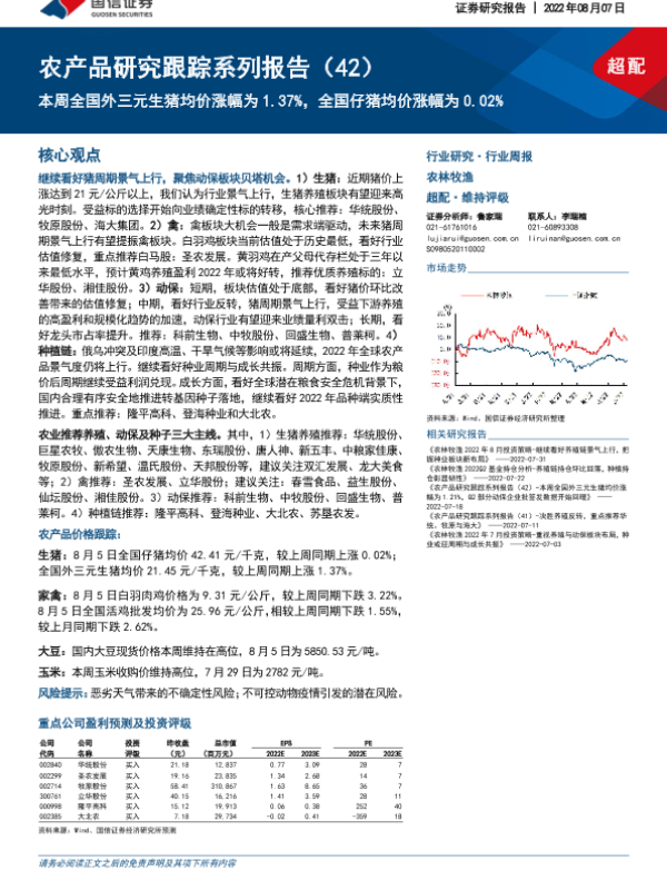【国信证券】【20220807】农林牧渔行业农产品研究跟踪系列报告(42):本周全国外三元生猪均价涨幅为1.37%,全国仔猪均价涨幅为0.02%-22页 行业研究