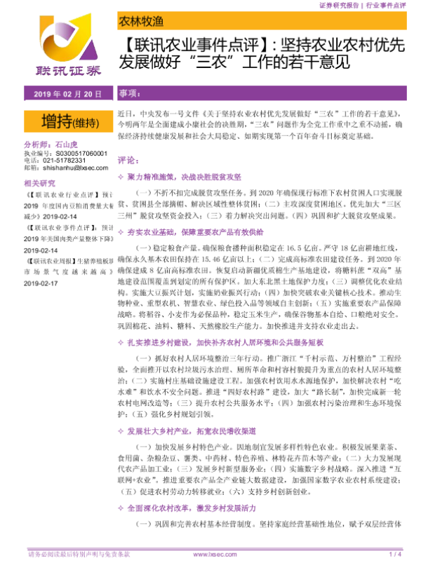 【粤开证券】【20190220】关于坚持农业农村优先发展做好“三农”工作的若干意见-4页 证券期货研究报告