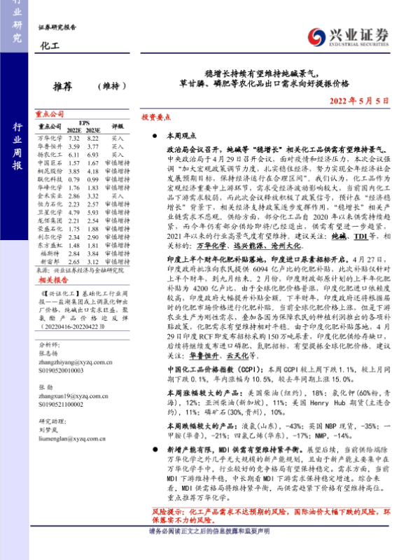 【兴业证券】【20220505】20220505-兴业证券-化工行业周报:稳增长持续有望维持纯碱景气,草甘膦、磷肥等农化品出口需求向好提振价格-49页 行业研究