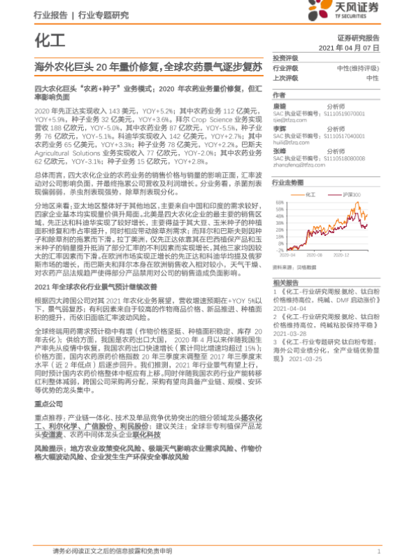 【天风证券】【20210407】化工行业专题研究:海外农化巨头20年量价修复,全球农药景气逐步复苏-6页 行业研究