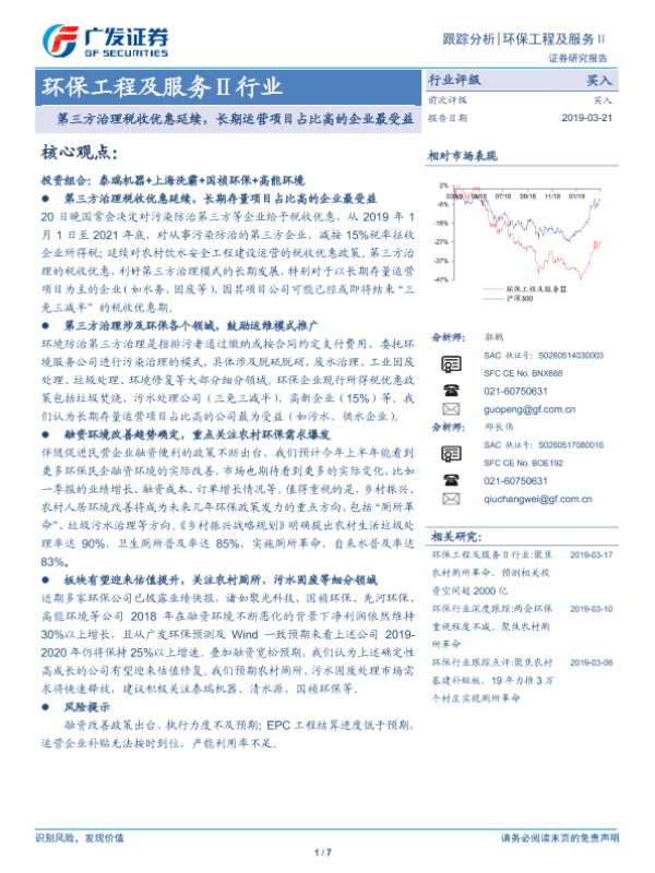 【广发证券】【20190321】第三方治理税收优惠延续,长期运营项目占比高的企业最受益-7页 行业研究