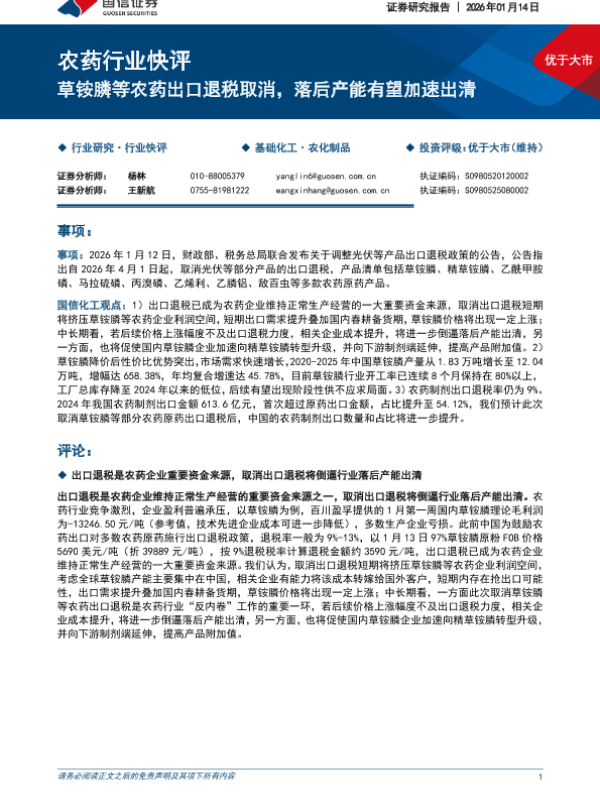 【国信证券】【202601】农药行业快评_草铵膦等农药出口退税取消_落后产能有望加速出清-6页 证券期货研究报告