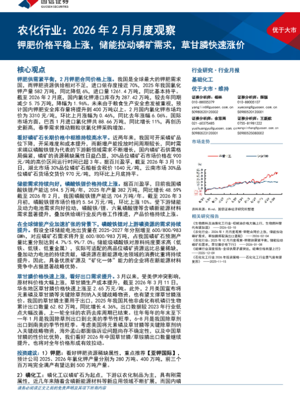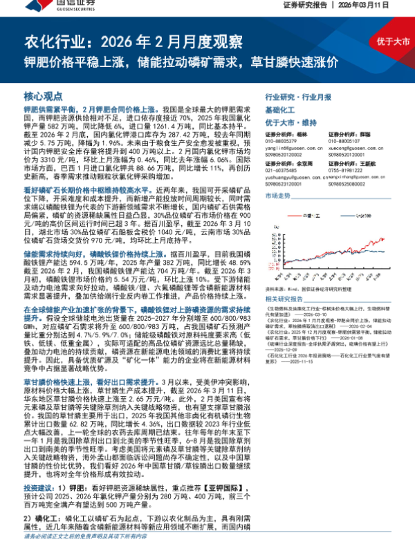 【国信证券】【202603】农化行业:2026年 2月月度观察:钾肥价格平稳上涨,储能拉动磷矿需求,草甘膦快速涨价-29页 证券期货研究报告
