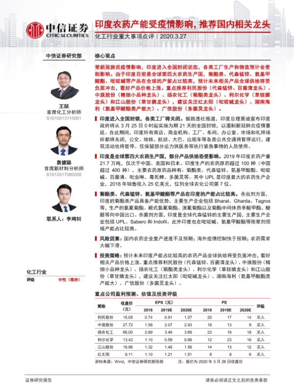 【中信证券】【20200327】化工行业重大事项点评:印度农药产能受疫情影响,推荐国内相关龙头-3页 行业研究