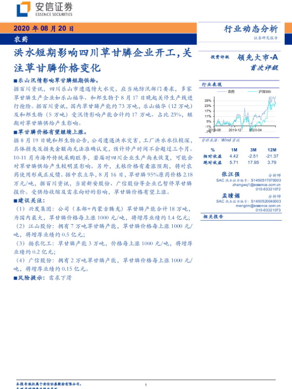 【安信证券】【20200820】洪水短期影响四川草甘膦企业开工,关注草甘膦价格变化-3页 行业研究
