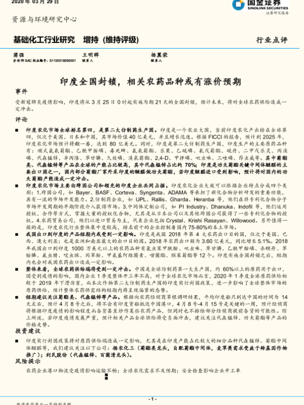 【国金证券】【20200329】基础化工行业研究:印度全国封锁,相关农药品种或有涨价预期-3页 行业研究