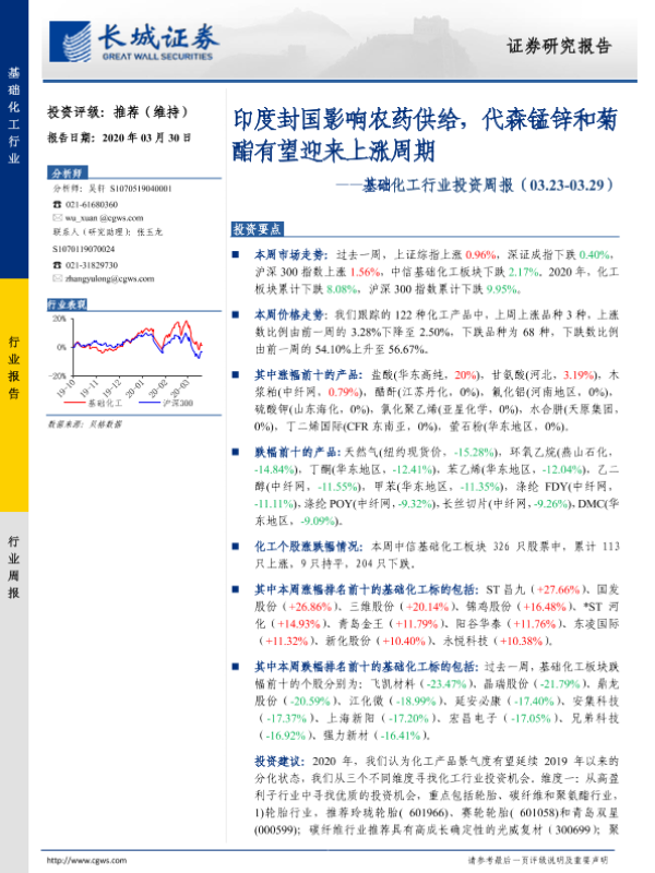 【长城证券】【20200330】20200330-长城证券-基础化工行业投资周报:印度封国影响农药供给,代森锰锌和菊酯有望迎来上涨周期-26页 行业研究