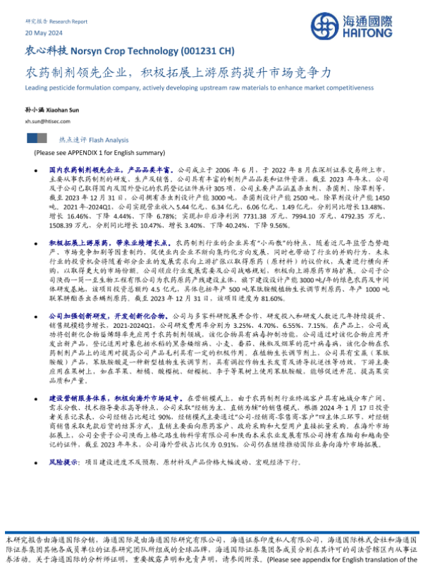 【海通国际】【20240520】农心科技-农药制剂领先企业,积极拓展上游原药提升市场竞争力-10页 行业研究