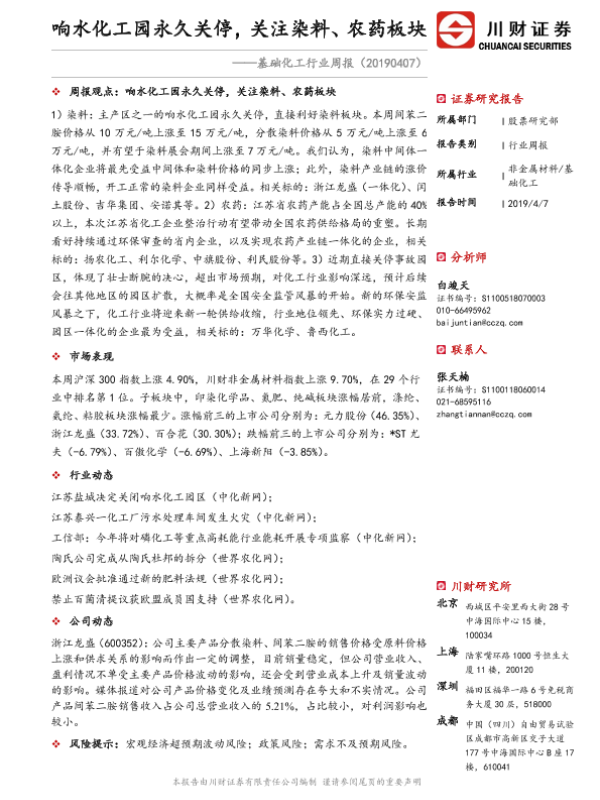 【川财证券】【20190407】基础化工行业周报:响水化工园永久关停,关注染料、农药板块-22页 行业研究