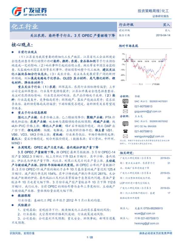 【广发证券】【20190414】20190414-广发证券-化工行业:关注农药,染料等子行业,3月OPEC产量继续下降-22页 行业研究
