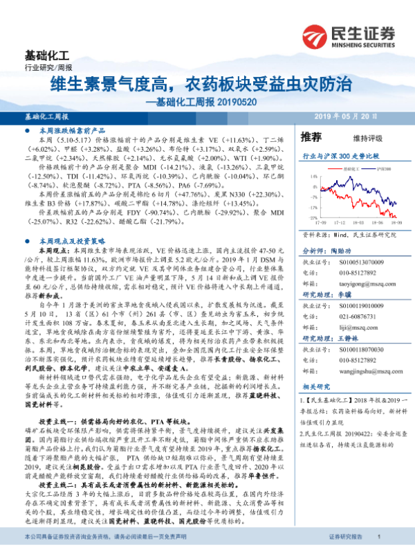 【民生证券】【20190520】基础化工周报:维生素景气度高,农药板块受益虫灾防治-30页 行业研究