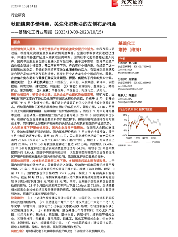 【光大证券】【20231014】基础化工行业周报:秋肥结束冬储将至,关注化肥板块的左侧布局机会-26页 行业研究