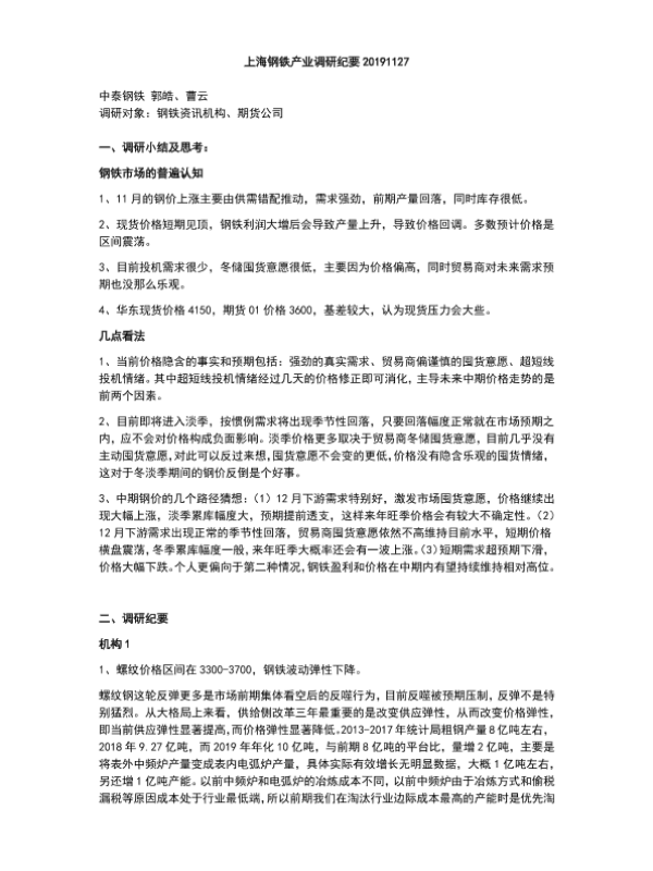 【中泰证券】【20191127】上海钢铁产业调研纪要-7页 市场调研